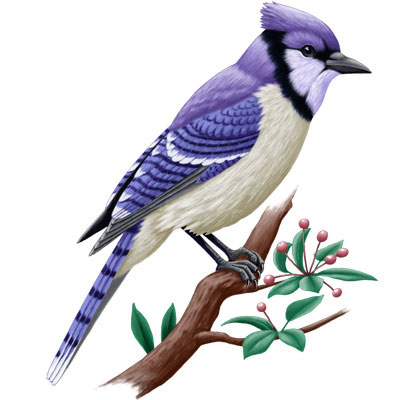 Blue jay bird. A cartoon blue jay bird perched on a twig.