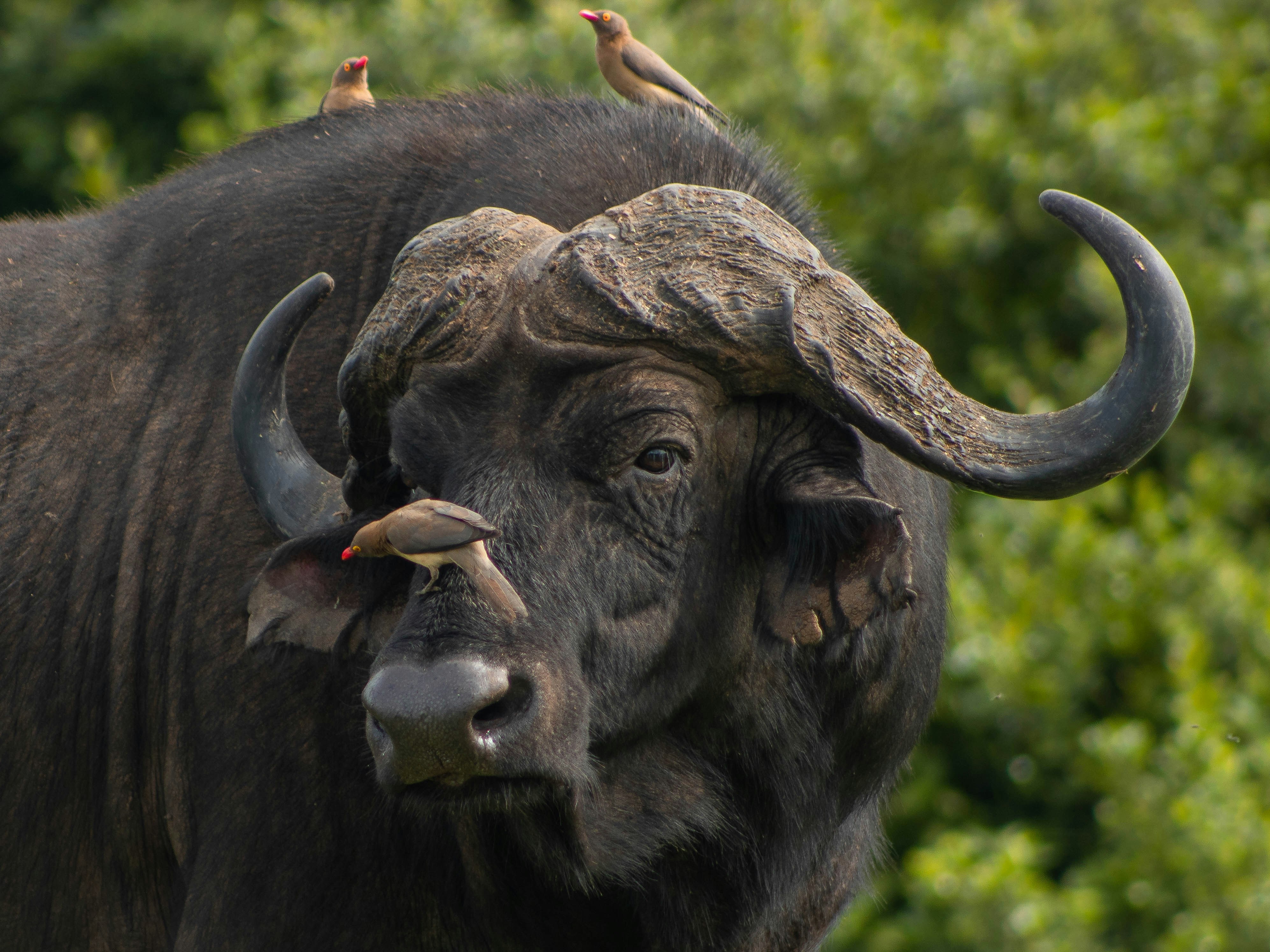 Yellow-billed Oxpecker on the face of a Cape Buffalo