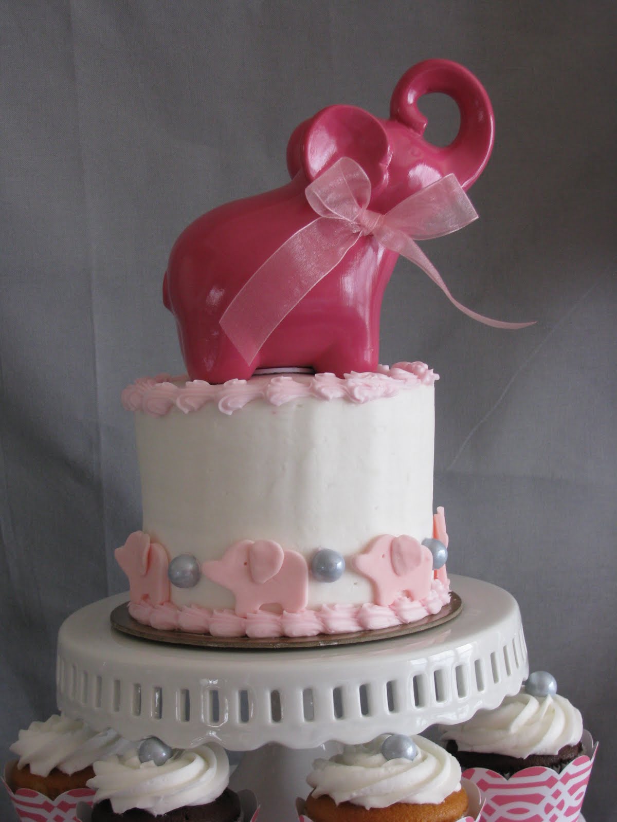 Baby elephant topper, pink and soft gray baby shower cake